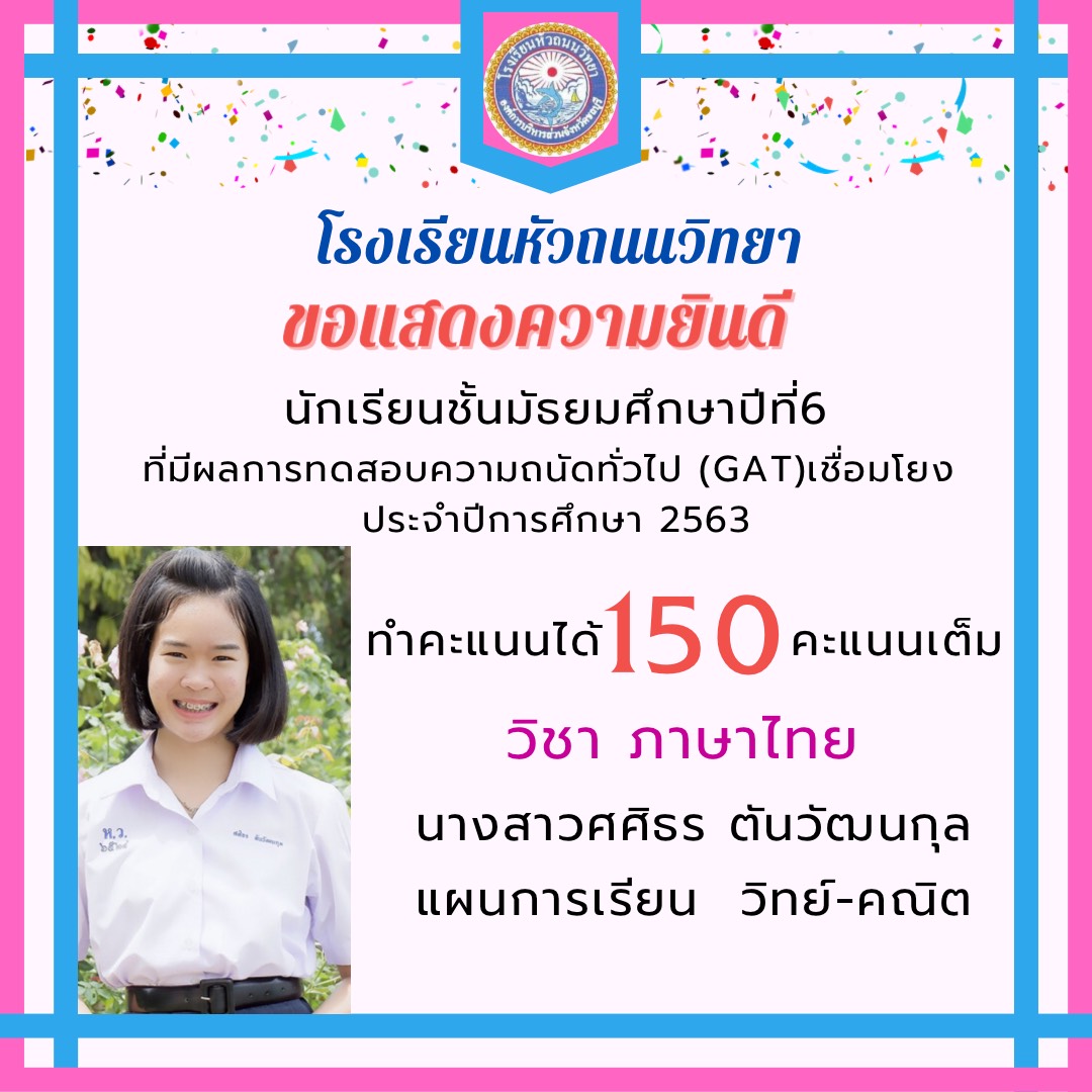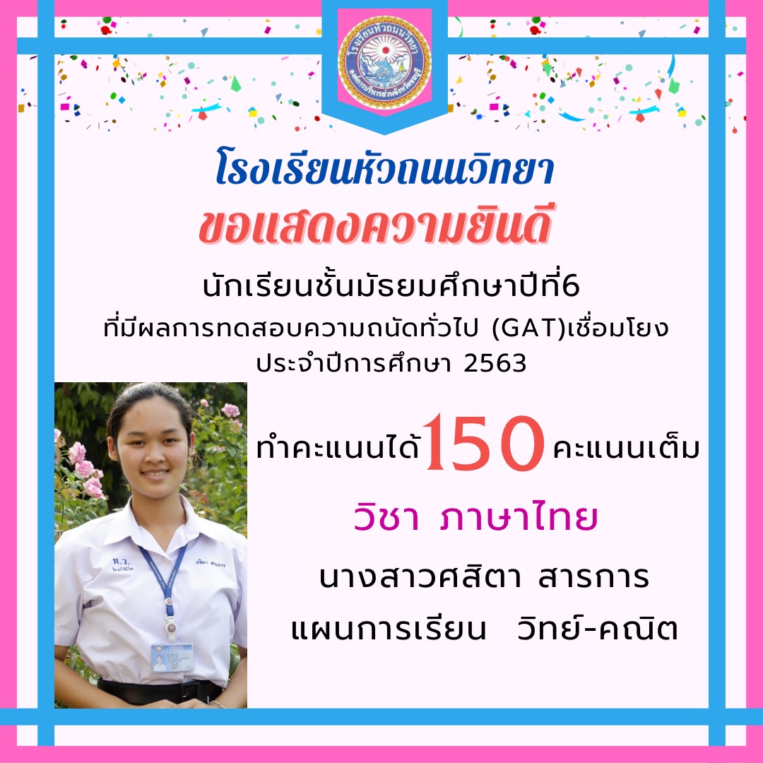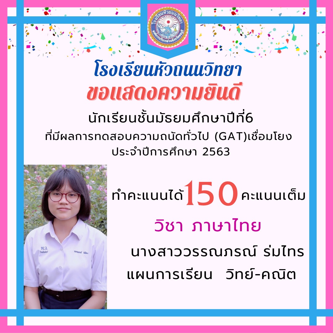 โรงเรียนหัวถนนวิทยา ขอแสดงความยินดีกับลูก ๆ นักเรียนชั้นมัธยมศึกษาปีที่ 6 ทั้ง 3 คน ที่มีผลการทดสอบความถนัดทั่วไป (GAT) เชื่อมโยง