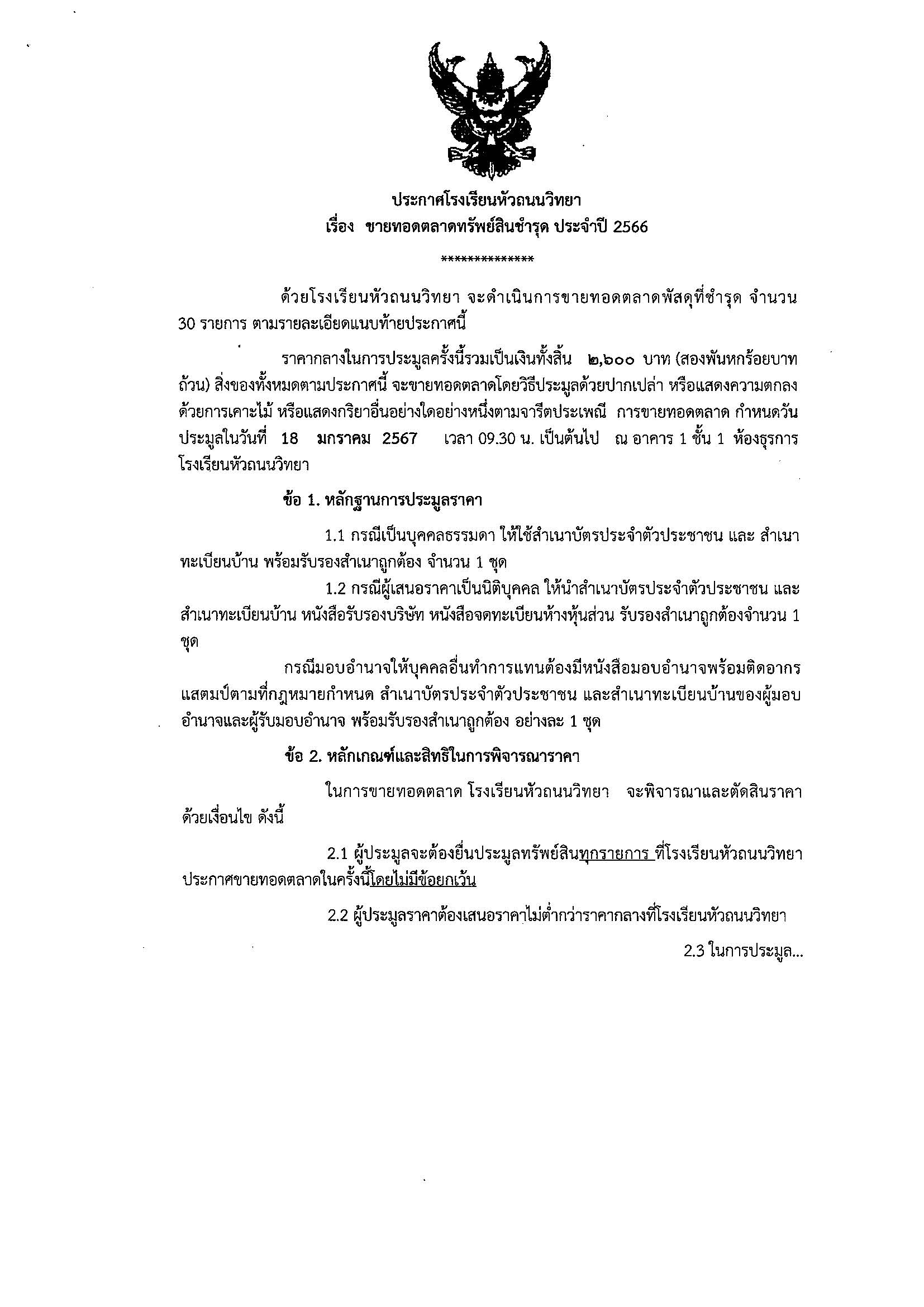 ประกาศโรงเรียนหัวถนนวิทยา เรื่อง ขายทอดตลาดทรัพย์สินชำรุด ประจำปี 2566