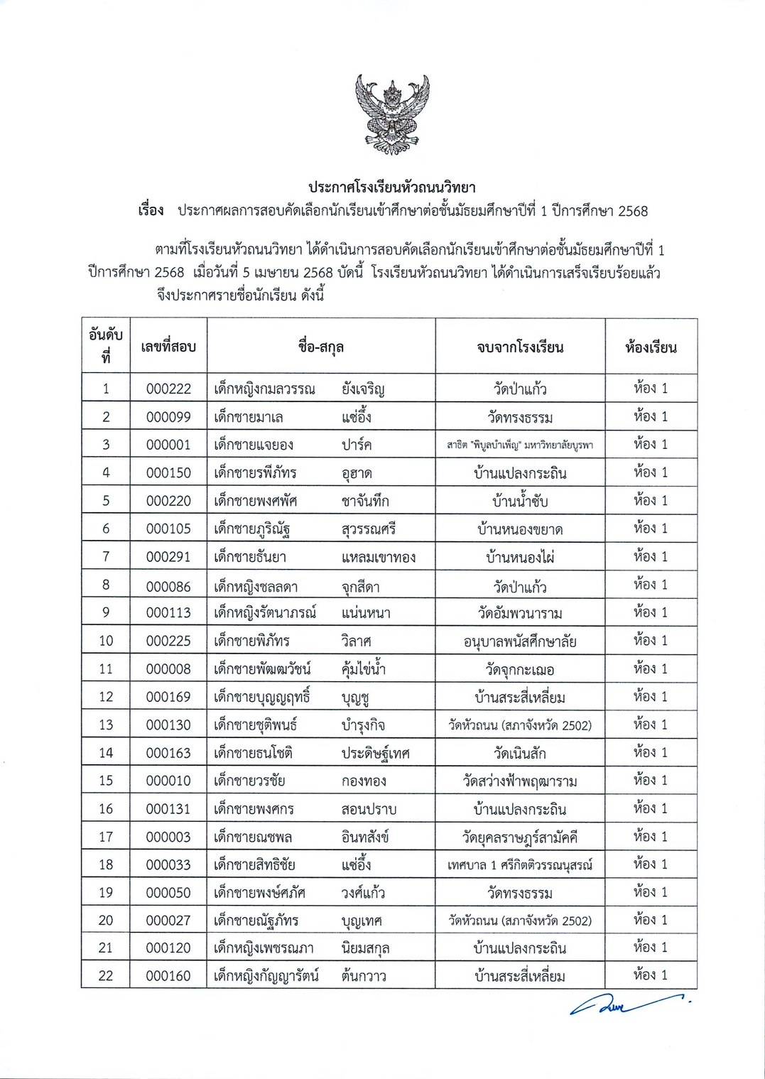 ประกาศผลการสอบคัดเลือกนักเรียนเข้าศึกษาต่อชั้นมัธยมศึกษาปีที่ 1 ปีการศึกษา 2568 ห้อง 1 - 4 เรียนเพิ่มเติมวิชาคณิต วิทย์ และอังกฤษ ห้อง 5 เรียนเพิ่มเติมวิชาภาษาจีน ห้อง 6 - 7 เรียนเพิ่มเติม วิชาพลศึกษา การงาน และดนตรี ศิลปะ ให้นักเรียนมาพร้อมผู้ปกครอง หากไม่ใช่พ่อหรือแม่ให้นำบัตรประชาชนมาด้วย เตรียมปากกาเพื่อเขียนใบมอบตัว และจ่ายเงินรวม 720 บาท 1.ค่าประกันชีวิต 300 บาท 2.ค่าบัตรนักเรียน 250 บาท 3.ค่าสมาคมผู้ปกครอง 100 บาท 4.ค่าคู่มือนักเรียน 70 บาท นำสำเนาวุฒิปพ.1 มาส่ง พร้อมเอกสารที่ยังให้ไม่ครบ ในวันพุธที่ 9 เมษายน 2568 ตั้งแต่เวลา 8.30 -12.00 น. เริ่มลงทะเบียน 07.30 น. - 08.30 น. แต่งกายด้วยชุดนักเรียนเดิมให้เรียบร้อย เหมาะสมกับสภาพความเป็นนักเรียน ค่าใช้จ่ายอื่น ๆ สามารถซื้อในวันวันเปิดเรียนได้ -สมุด ชุดละ 100 บาท -เสื้อพละ ราคา 240 บาท เบอร์ 50 ขึ้นไป ราคา 300 บาท -กางเกงพละ ราคา 240 บาท เบอร์ 50 ขึ้นไป ราคา 300 บาท -กระเป๋านักเรียน ราคา 220 บาท -ถุงเท้านักเรียน ราคา 20 บาท -โบว์ผูกผม ราคา 30 บาท